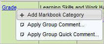 Add a new category by clicking the topic/subtopic hyperlink then select Add Markbook Category: As explained in Creating a New Markbook Step 1. Create Categories, a category is added under the topic (or subtopic) that contains the markbook (e.g. Grade topic). Click the topic (or subtopic) hyperlink and choose Add Markbook Category option to begin.
