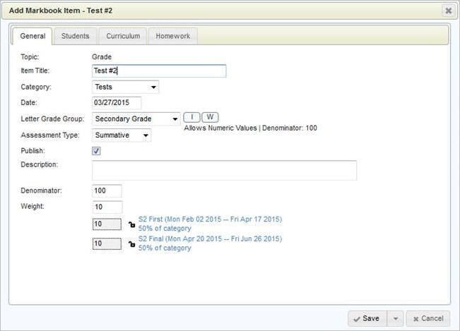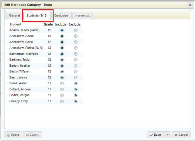 The add/edit category interface has 4 tabs. The General tab is where the category must be defined accurately. The Students tab presents the students in the class and allows the teacher to exclude students from the category as explained in Excluding Students from Category or Markbook Item. The Curriculum tab allows a teacher to associate curricular elements with a markbook category or item, while the Homework tab allows homework to be associated with the category or markbook item.