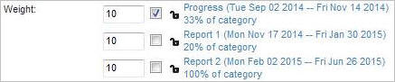 This weighting section is slightly different depending on whether the markbook is using the cumulative or non-cumulative markbook style (this style is determined by the school office). If check boxes appear beside the weights, then refer to the instructions for the non-cumulative markbook. If no check boxes appear beside the weights, refer to the cumulative markbook.