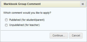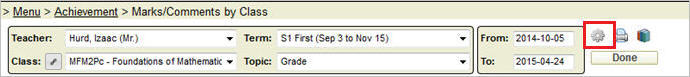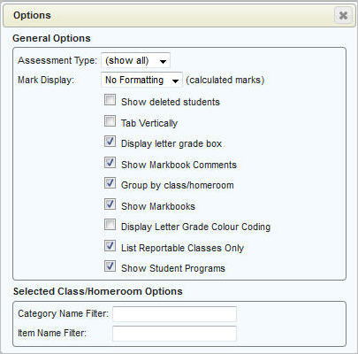 Group by Class/Homeroom: When you have all classes selected, checking this box will cause all topics from each class to be grouped together. Unchecking it will cause all topics to be listed one after another regardless of class. Either option can be helpful depending on your method of mark and comment entry/review.