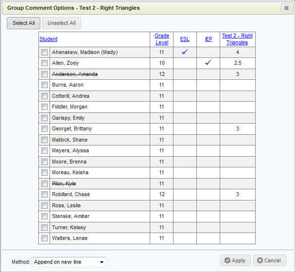Show deleted students: When this option is selected, students who have a deleted enrolment status, and students who have dropped the class, will appear in the list but with strikeout text. (e.g., Pilon, Kyle)