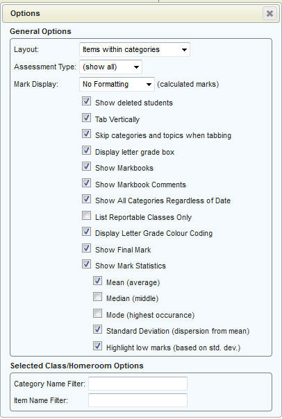 Selected Class/Homeroom Options (These filter settings apply only to the selected class or homeroom):narrow down which categories and items view on the screen. This can help clean up a very busy markbook screen. Click here to see Filter settings.
