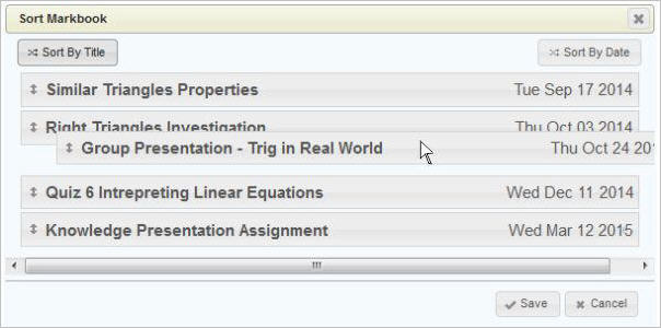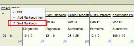 By default, markbook categories and items are displayed in the order in which they were created. You have the ability to change this order. To sort your markbook items within a category, click the category title and choose Sort Markbook.