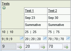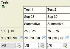 Here is an example 3 tests with a denominator totaling 133, and therefore, the Tests category is weighted as 133 toward the overall report card mark. Also note that each test is weighted the same as the test denominator.