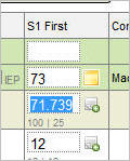 Just like the entry of report card marks, there may be some mark cells that are disabled. In the above example, the cells in the Final Mark column have a grey background because the office has locked that term for now (note: many schools don't use the final mark but if they do, the office would enable it for the final report card, however marks will still calculate to that term even though it is locked). With markbooks, mark cells may also be disabled for mark entry by showing N/A if the student is excluded (see Excluding Students from Category or Markbook Item). Markbook items, such as "Fractions" in the above example, are given a date, and if that date is entered after the end of the term, the mark cells are also disabled. If the user holds the mouse over one of these mark cells, a message will appear indicating this. In this example, the date may be edited by clicking the Fractions hyperlink to access the Edit option (as explained later)