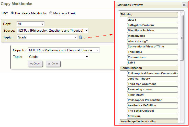 lets you see the contents of the markbook before you copying. Select a Homeroom or a Class. If you select a Class and there are Topics associated make your selection from the drop-down list you can now click the little I icon.