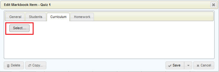 Curriculum is linked to markbook categories or markbook items, and is accessed using the Curriculum tab available when either adding or editing the category or item. If unfamiliar with adding/editing markbook items or categories, please see Setting Up a Markbook.