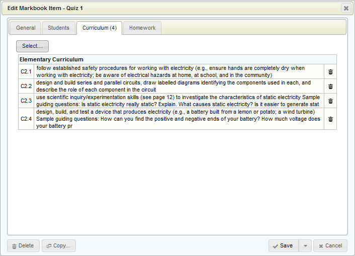 Click Save when satisfied with your selection. The selected curricular items will appear on the Curriculum tab (as shown below), and if an item is to be removed, click the trash can icon (in the far right column):