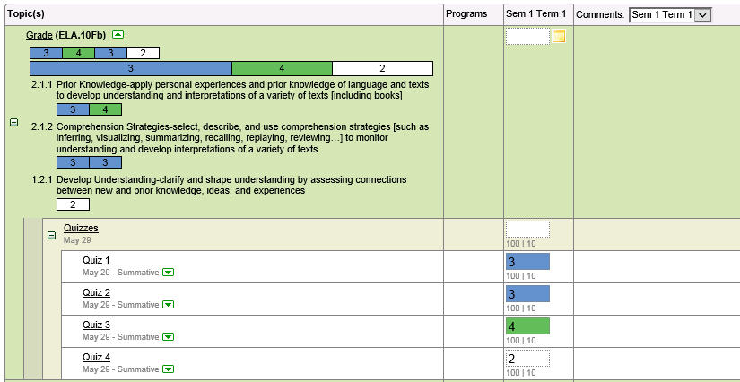 This next feature, is only available in the Marks/Comments by Student interface, as the curriculum arrows for the topic/subtopics (e.g. report card marks) are not available in Marks/Comments by Class. Clicking the arrow beside a topic/subtopic (Grade in this example) will expand or and collapse the curriculum details. For example, clicking the green down arrow in the above image will expand to show the information in the image below, and clicking the arrow again will collapse it.