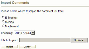 Comment banks that are in specific formats can be imported into My Comments. Comments can be imported from E-Teacher, MediaX or Maplewood.