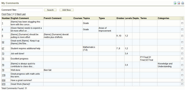 You can create and manage a bank of comments that are only available to you. To access your comment bank, click on My Comments from the Achievement menu. You will see a screen similar to the one below.