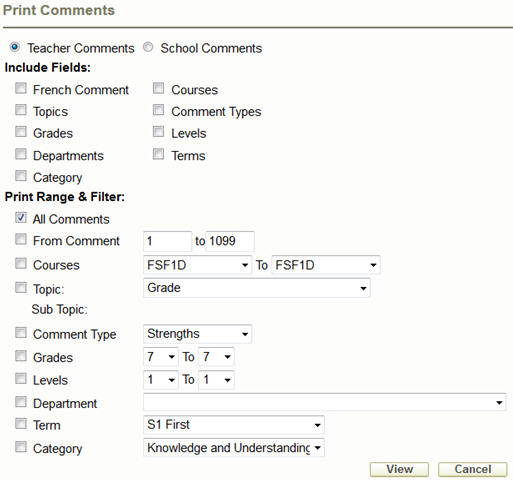 Filters can also be used in the printing of the comment bank.