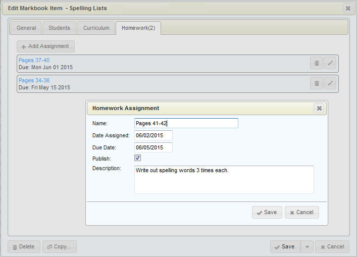 In the example below, the item called Spelling Lists has two homework items assigned to it, and is having one more added, called Pages 41-42. This homework is published, so the parents/students will see it.