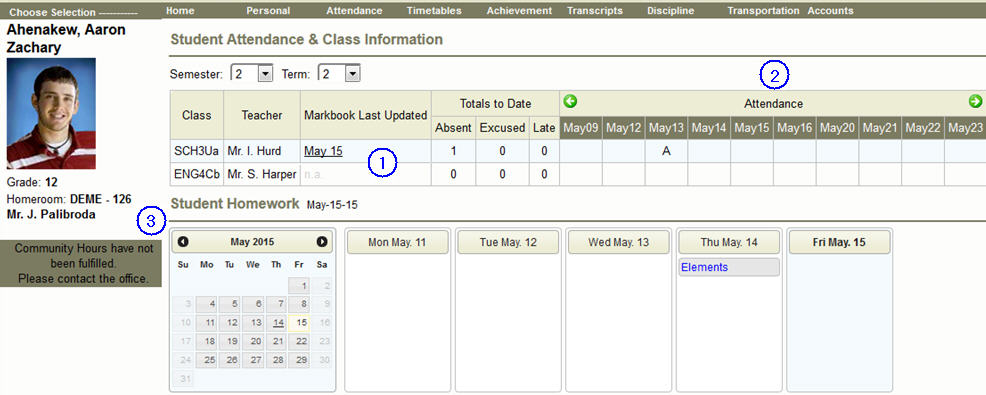 The student/parent can see relevant information at a glance in regards to attendance, achievement and homework. Classes are listed at the top with the markbook date and attendance beside each class. The user can click on the markbook date to see the details of that markbook, and on the homework title to see the details of that homework.