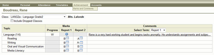 In addition to the information on the Home screen, parents/students can also see detailed information about the student’s marks. In the menu system, choose Achievement – Marks and Comments: