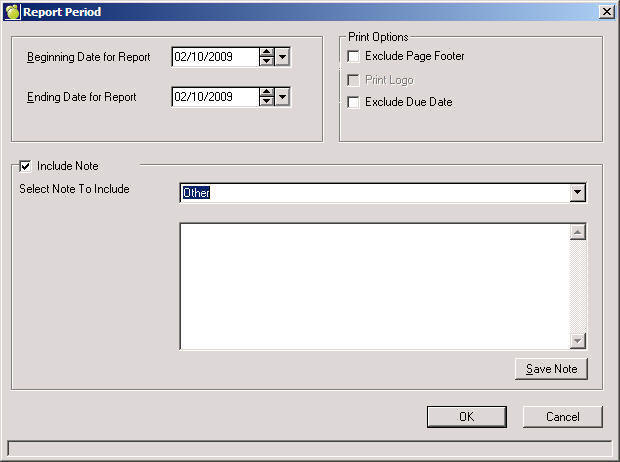 to include a note (if predefined under Setup, Report Notes), check the box and either select a note or create a new note. To add the new note the defined list of Report Notes, click Save Note.