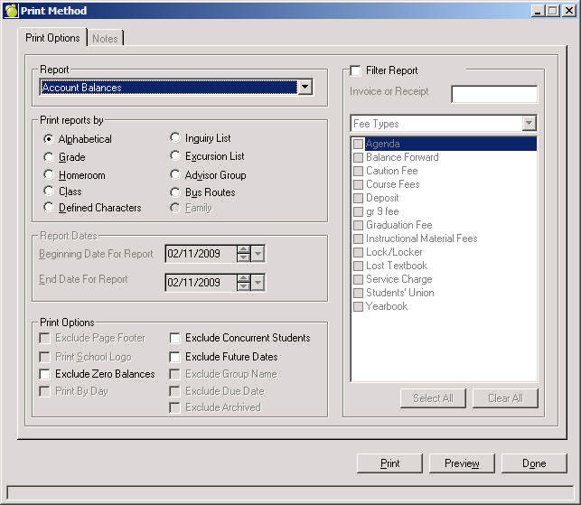 This will exclude students and/or accounts with a zero balance when printing Account Balance. This feature is particularly helpful when reporting on outstanding balances as it will only include students with a debit/credit balance.