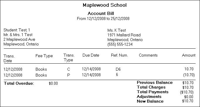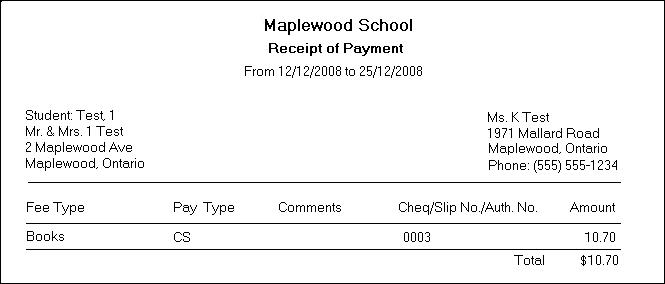 Can be printed from the reports area or at the time of making a payment for a student. Specify the date range and all changes made to a student will print along with due dates (if selected), account reference numbers and the amount of each charge. A total amount charged will also print.