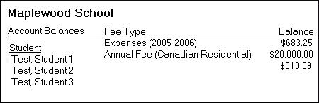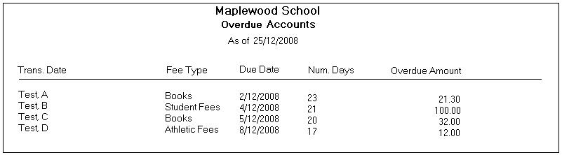 Choose Accounts, Reports and click the Overdue Accounts option. Then select the students you would like the reports printed for, and finally specify the Report Date parameters. You will see this type of sample report