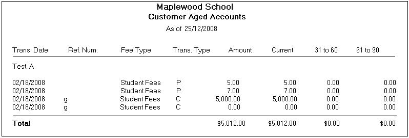 The Customer Aged Account report provides details of the money owed to the school. It reports the fee type, amount owing and then displays in three relevant columns the outstanding amount, current, 31 to 60 days, and 61 to 90 days. The days are based on the system date and include all dates.