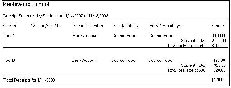 Receipt summary is a report of all of the receipts for the selected period of time and what payment type was used. It is of particular benefit to assist the school in totalling receipts. It shows you the following. The report will break down into groups the Payment Method as well as the Fee Type and give a total of each group. After totalling each group of Payment Method it then gives you a Total for all payment method groups combined. The Receipt Summary can be used to show breakdowns of Fee Types and Payment Types.