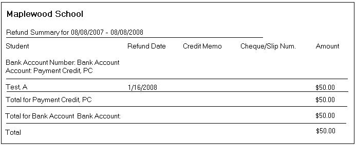 Within a defined date range this reports all students who have had either a cash refund or a payment/credit issued to them as well as the amount issued.