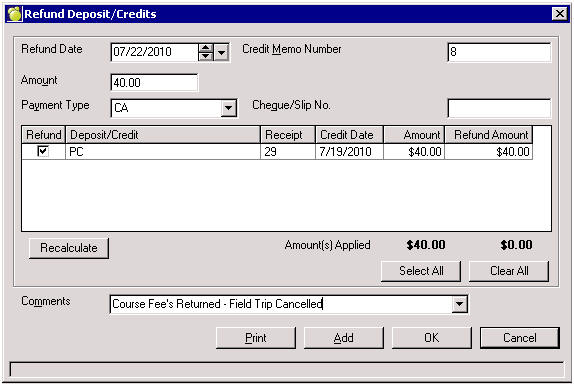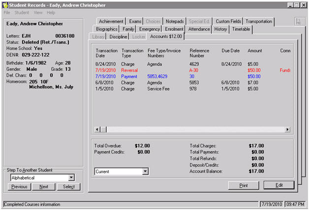 Reversals appear as red entries on the student record and will appear on Account Bills and other similar reports as an N with their respective receipt number. A reversal should be used in instances of an NSF cheque.