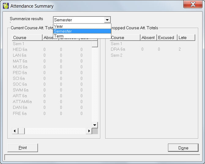 Choose Attendance, Display/Modify Register and select a student. Click the Summary button on the Attendance box to View and Print attendance. You can view the summary by Year, by Semester, and by Term. Depending on the date, the program will show the attendance summary for its corresponding semester/term. To send the Summary Results to the printer click Print.