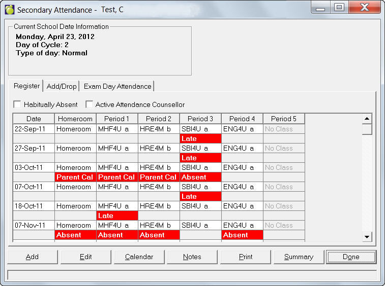 If you want to view or edit the Attendance Register, choose Attendance, Display/Modify Register and select a student. You will see an editing box similar to this one: