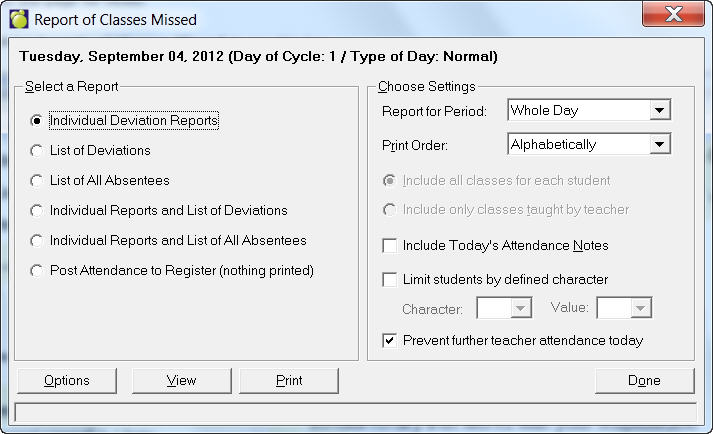 Choose your Settings: Report for Period - select Whole Day or specify the period. Print Order - Alphabetically, By Homeroom List, By Grade. Select either to include all classes for each student or to include only classes taught by teacher.