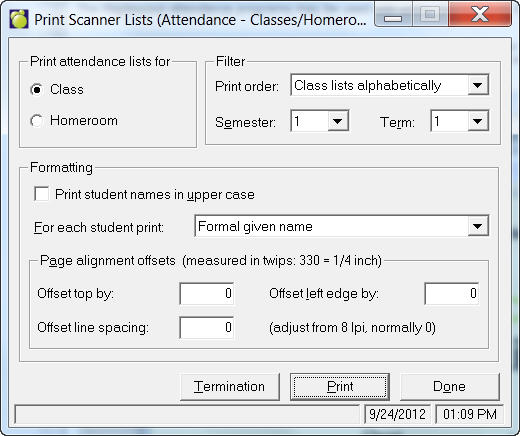 This Scanner Lists feature prints the names of the students in each class or homeroom onto the scanner sheets along with some coding that is required by the scanner. Scanner Lists also prints a Termination Sheet for the NCS scanner. When printing homeroom or class attendance, there is a printing order that you must first specify: click Print on the Scanner Lists box and select a start and end class or click the single class check box.