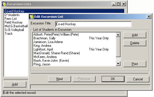 When adding a new excursion list, you first enter the title (up to 20 characters) then click Add to enter the students who are associated with that list. Select the students by using the select student window that pops up.
