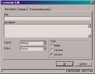 To add a new curriculum select a branch from the tree and click the Add New Curriculum icon or choose New Curriculum from the File menu. The following editing screen will appear: