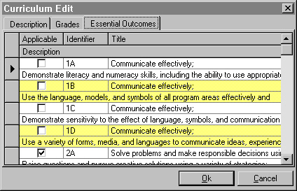 This is more detailed information describing the level of achievement. Open an item, click the Edit button and then click the Essential Outcomes tab. Click on a description and enter new text.