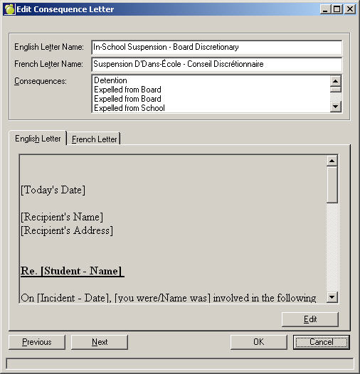 To define letters choose Incidents, Define Consequence Letters. A list of letters (if any) will appear. To add a letter, click Add. To edit an existing letter, select the one and click Edit. This is an example of an editing box. The adding box will look the same but will have no information entered. This letter must be associated with specific Consequences (the example above is associated with “Suspension-Discretionary” and “Parent Notified/Interview”). Each consequence can only be associated with one letter.