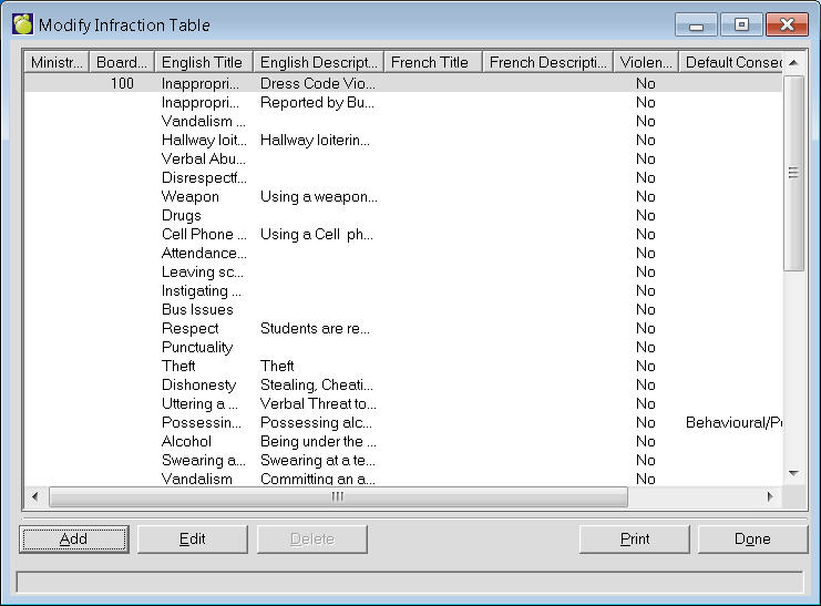 This table is initially populated from Maplewood based on the Ontario October Board Report suspension and expulsion criteria. If you are an Ontario school, it is strongly recommended that you do not alter the defaulted table entries (Ministry codes 01 to 05 and 19 to 25) as they will be of value when completing the October Board Statistical Report. Schools outside Ontario may delete or edit these first entries.