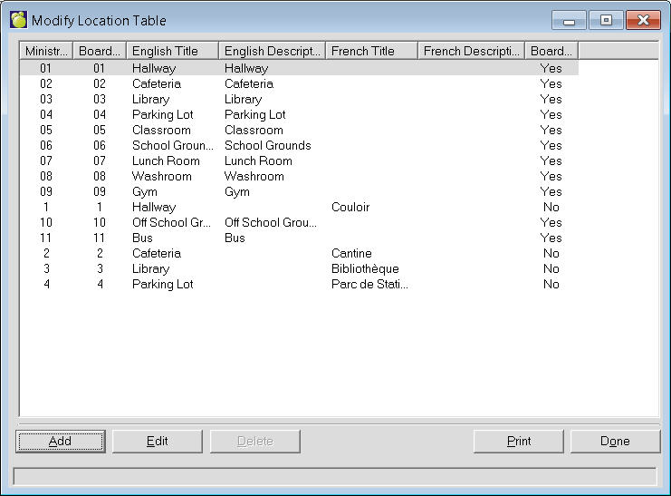 This table is initially populated with sample locations where incidents might occur (e.g. hallway, cafeteria, library, parking lot). These entries may be deleted or edited as needed. Only a title (English or French) is required.