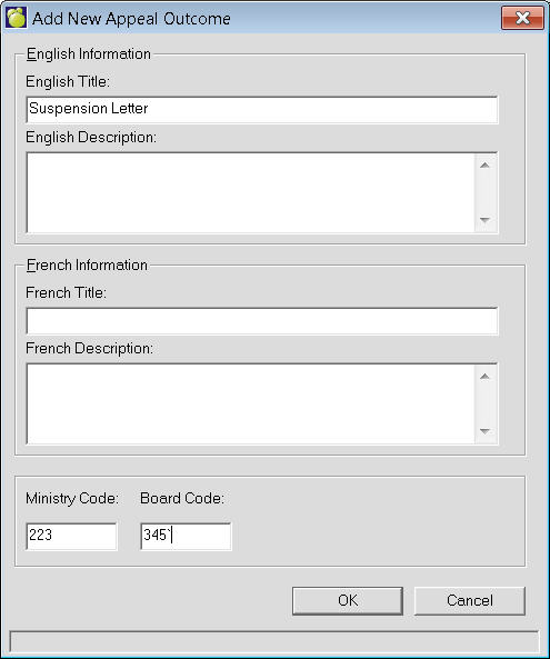 To define Appeal Outcomes, choose Incidents, Define Appeal Outcomes. A list of appeal outcomes (if any) will appear. To add a new one, click Add. To edit an existing appeal outcome, select one and click Edit. This is an example of an editing box. The adding box will look the same but will have no information entered.