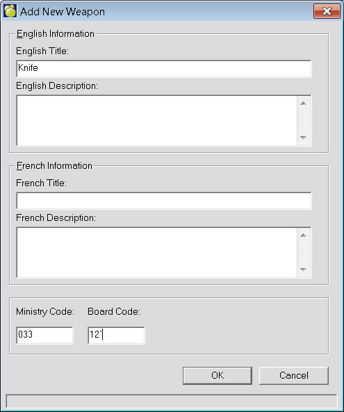 To define weapons choose Incidents, Define Weapons. A list of weapons (if any) will appear. To add a weapon, click Add. To edit an existing weapon, select the weapon and click Edit. This is an example of an editing box. The adding box will look the same but will have no information entered.
