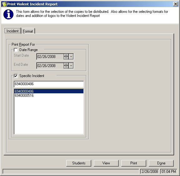 3a. Incident Tab: Click Date Range and select a Start and End date, or select a Specific Incident that you would like to include on the printout.