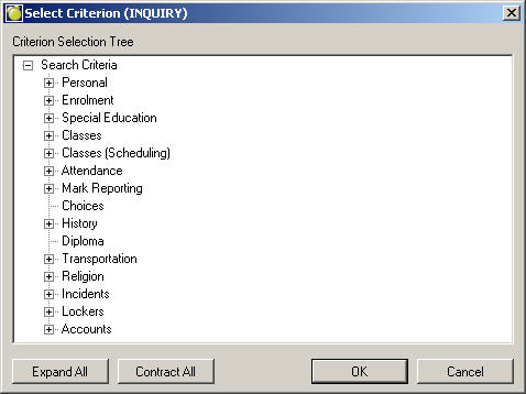 The criteria which the students will match for the Inquiry list must be selected from the Criterion Selection Tree as shown in the above screen. If the criterion you want is displayed, choose that specific criterion by double-clicking the criterion, or by pressing enter key. If the criterion that you want is not displayed, double-click the area of student information it belongs to or click on it once and press the Enter key. That area of the tree will expand to display further information below.