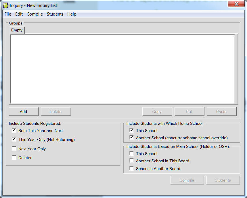 The Co-op Manager version of Inquiry does not have Include Students Registered or Include Students With Which Home School options.