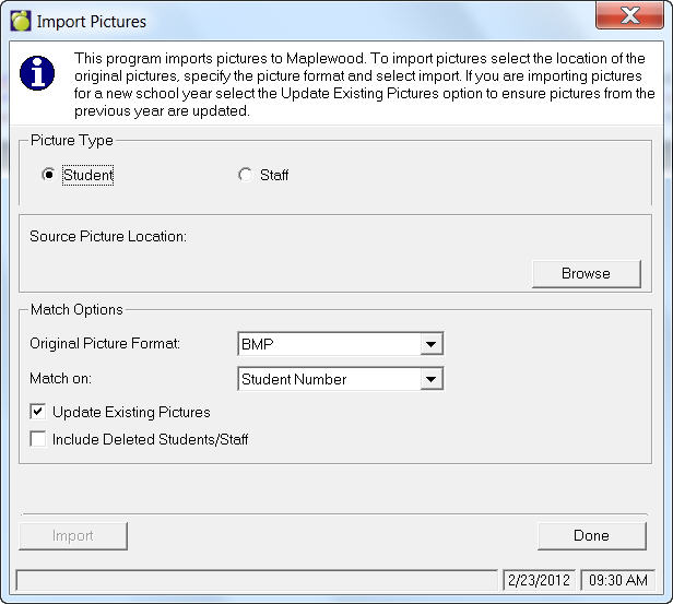 - In Maplewood for Windows go to File, Import, Student Pictures. Select Picture Type, Student or Staff.