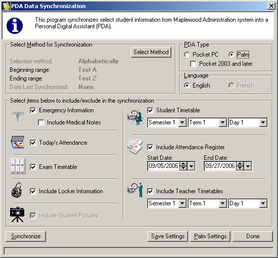 - Select items to include in the synchronization. Selecting minimal attendance register and timetable ranges will reduce the amount of time it takes to synchronize.