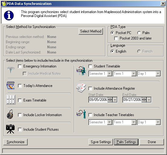 - Select items to include in the synchronization. Selecting minimal attendance register and timetable ranges will reduce the amount of time it takes to synchronize.