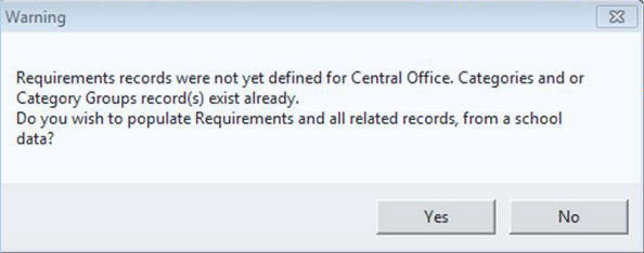 1. From Central Office, choose Marks, Define Requirements or Define Categories or Define Category Groups. Either one of these options will display a message: