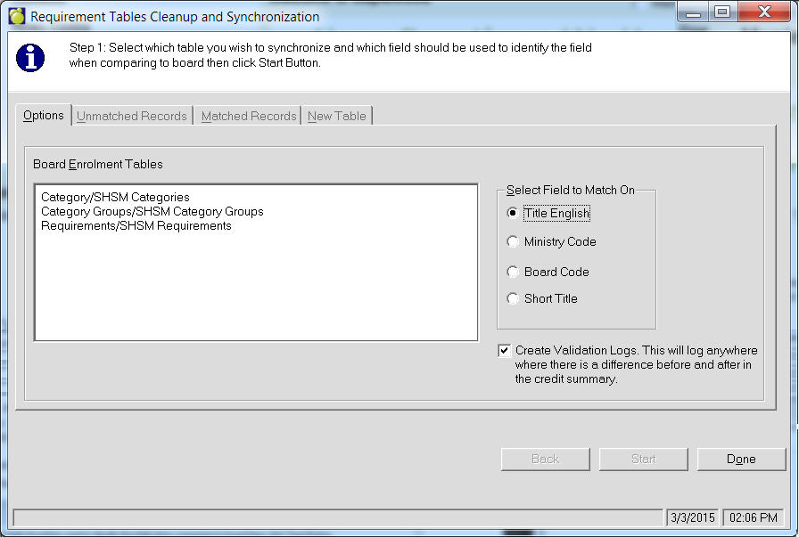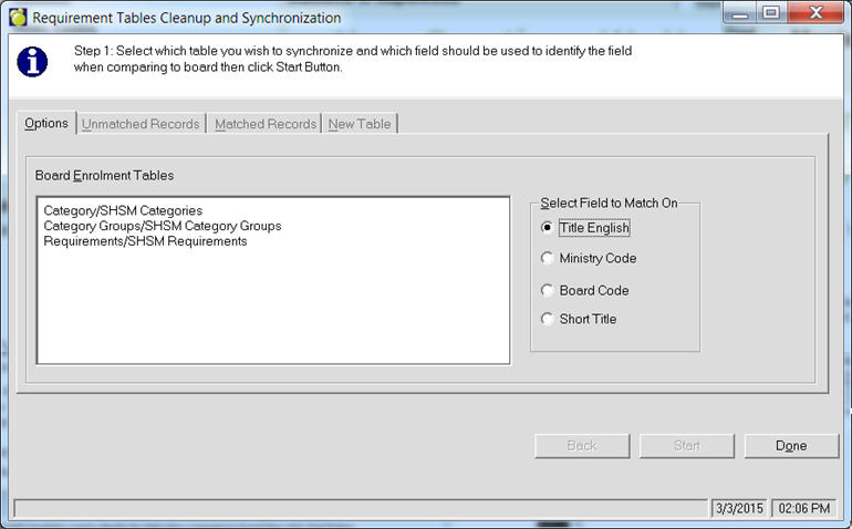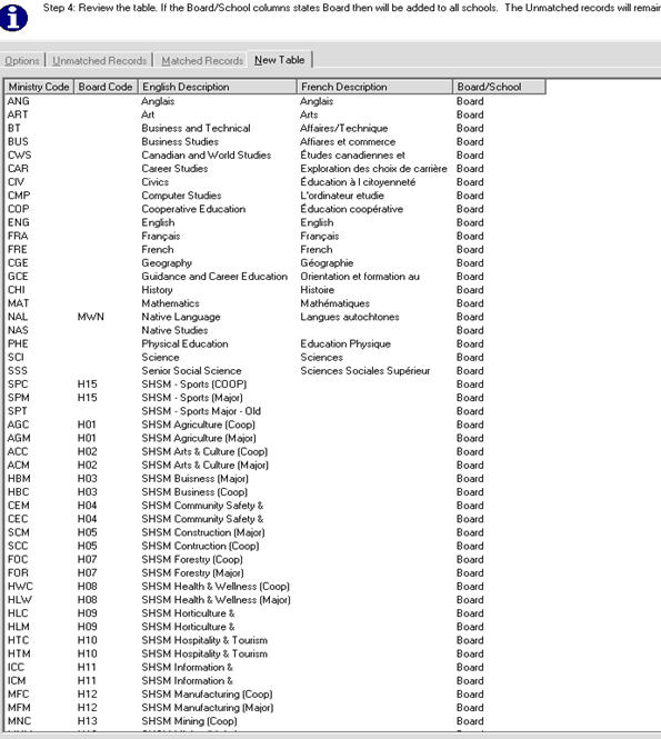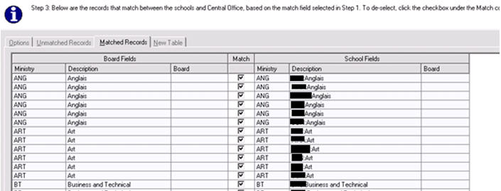 The following interface will appear (outside Ontario will not see anything that refers to SHSM which is Ontario’s Specialist High Skills Major certification program). Select the field to match on (depending on what key fields you have used in your table definitions). The following example matches on English Title.