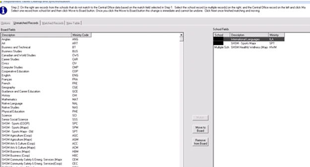 The user will be presented with the differences between what is currently defined at the board, and what exists at schools, that either does not exist at the board or is different than what exists at the board. There are three options in the Unmatched Records tab. The user can select to Match, Move to Board, or Remove from board.