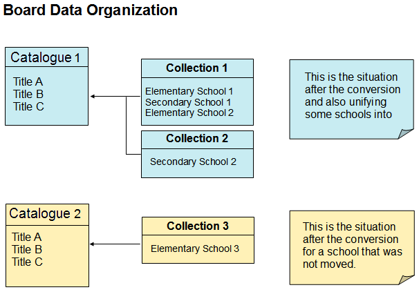 After the initial conversion one Catalogue and one Collection are created for each school. So at that point the school belongs to its own Collection and using its own Catalogue and