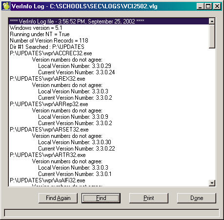 If the program finds nothing incorrect, you will be returned to the main Maplewood System. If it finds anything incorrect you will see a box similar to this one. If there are mismatched files please call Maplewood to either obtain a current set of applications or an updated version DB. We recommend that you print the VerInfo Log and have it handy when you contact Maplewood Support at 800.265.3482.